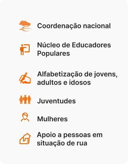 O Movimento de Educação de Base promove um serviço de capacitação de agentes de educação com o objetivo de fomentar a Educação Popular com jovens, adultos e idosos. Organismo da Conferência dos Bispos do Brasil (CNBB), o MEB nasceu em 1961, sendo o precursor da educação a distância, por meio das escolas radiofônicas, destinadas aos trabalhadores e trabalhadoras do campo, comunidades quilombolas e comunidades indígenas. Hoje atua nas cidades e periferias, na construção de projetos comunitários em Direitos Humanos, Ecologia integral, defesa dos territórios e protagonismo de juventudes.